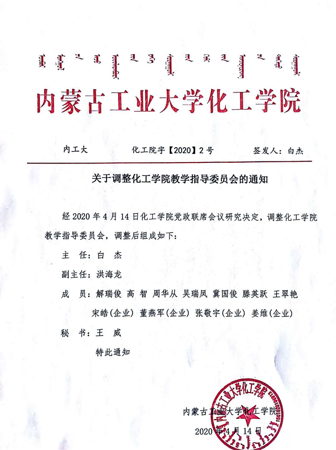 关于调整内蒙古工业大学化工学院教学指导委员会的通知