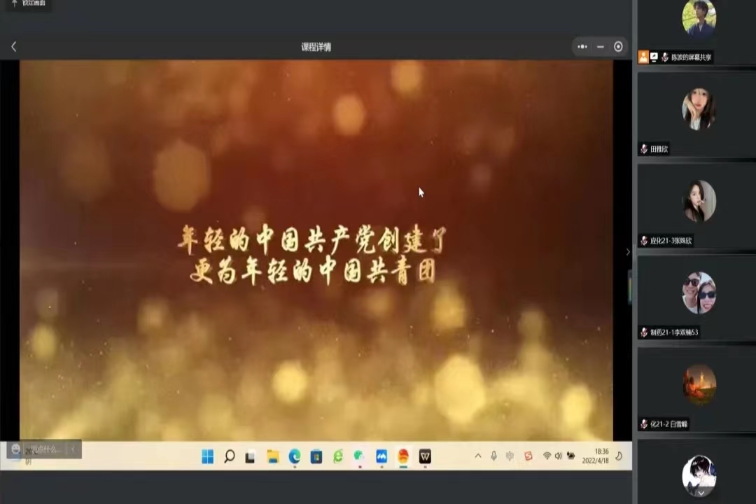 4月18日,化工学院团委组织开展“喜迎二十大,永远跟党走,奋进新征程”为主题的党的青年运动史专题学习,学院部分青年团员共200余人参加,学习以线上形式进行。