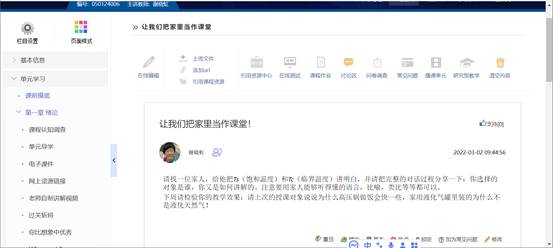 再比如设置了“让我们把家里当作课堂”,请每位同学找一位家人,用自己的语言,给他把一些与生活相关的,同时又是课程中的重要概念讲明白,并请分享:你选择的对象是谁,你又是如何讲解的。隔一周再请同学们检验一下自己的教学效果,回访上次的教学对象,提出问题进行测试,了解其掌握情况,并把交流过程分享到讨论区。
