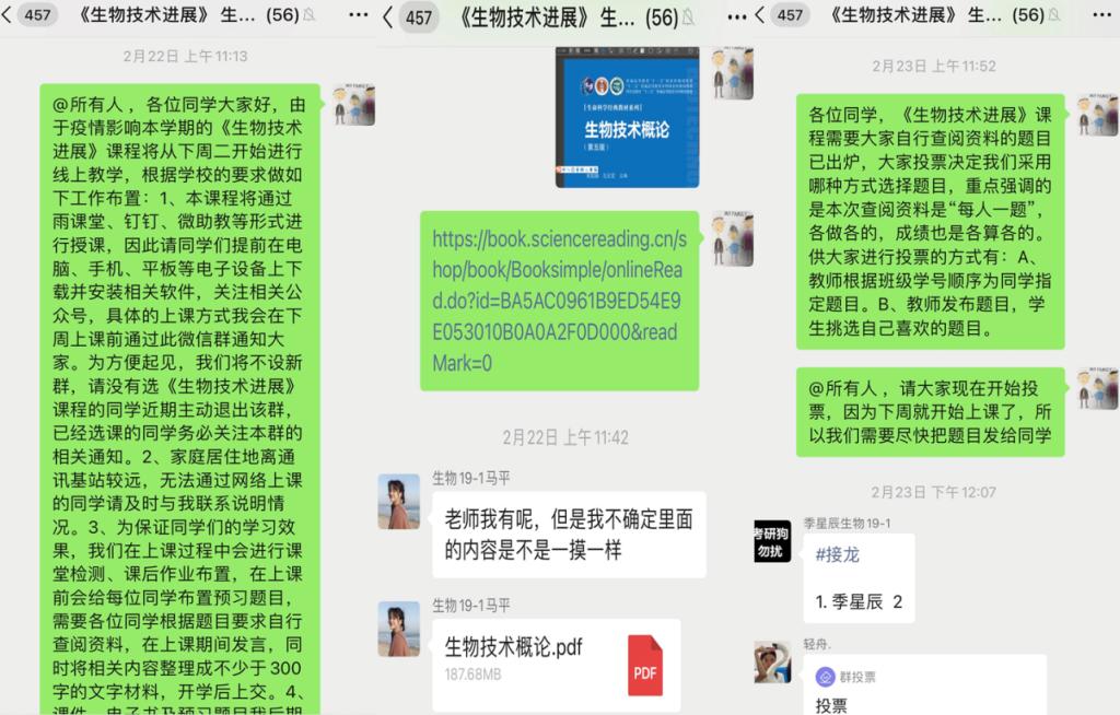教师利用“课程微信群”发布通知,分享学习资源,与学生进行交流互动。同时在“雨课堂”发布授课课件及相关复习资料。学生可通过“腾讯会议”或“雨课堂”观看课程回放,复习所学内容、巩固课堂练习。