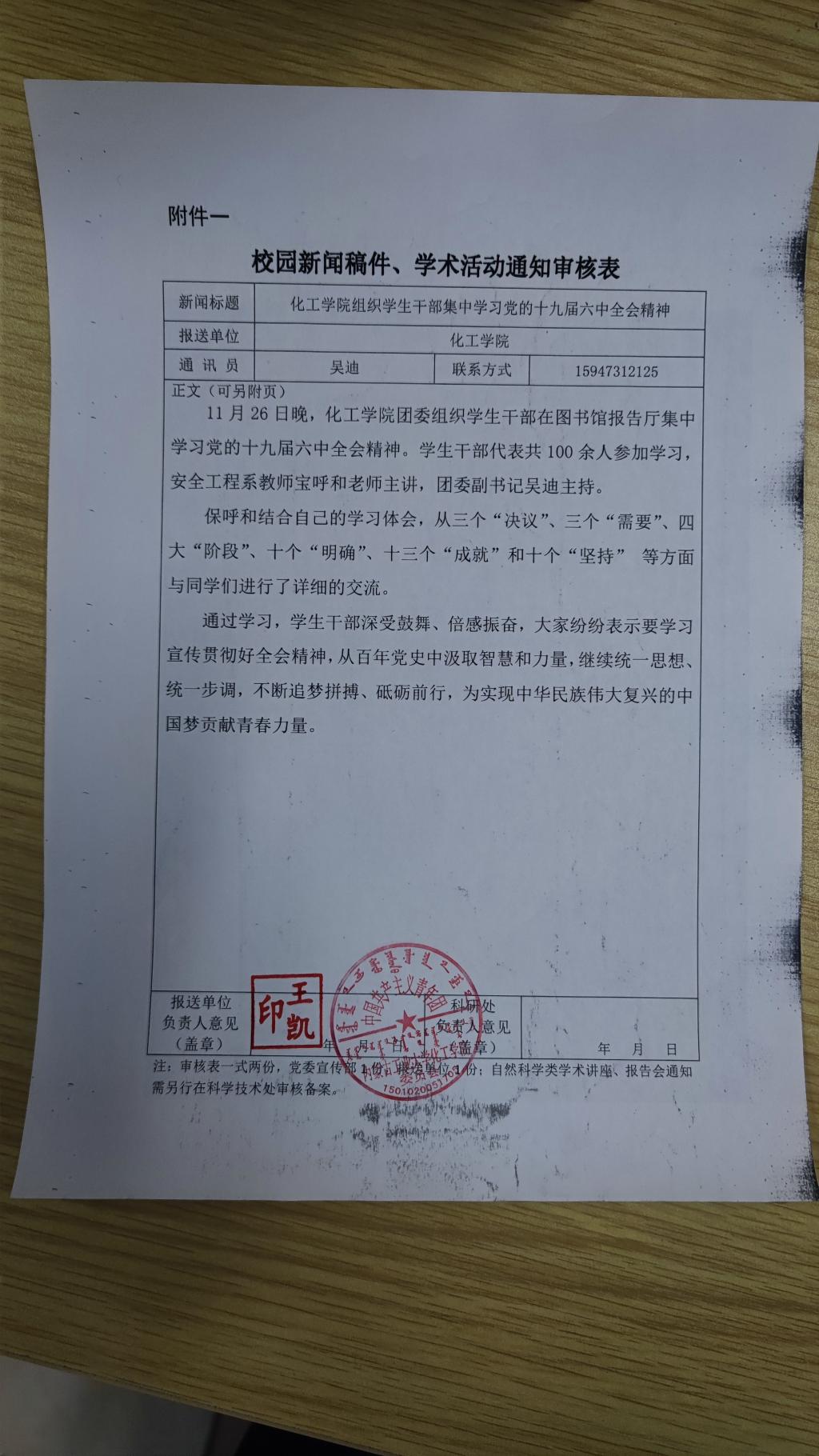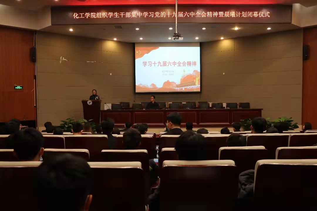 11月26日晚,化工学院团委组织学生干部在图书馆报告厅集中学习党的十九届六中全会精神。学生干部代表共100余人参加学习,安全工程系教师宝呼和老师主讲,团委副书记吴迪主持。