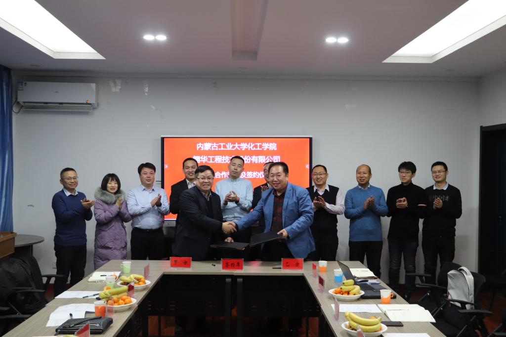 翱华股份公司生产副总经理卢锦明,副总工程师贾敏、董燕军,轻纺医药化工工程设计所所长王震宇、项目质量管理部主任郝瑞宇、综合办公室刘迪、建筑工程设计所朱彤彤;学院化学工程系系主任解瑞俊,教师代表陈天嘉、孙映晖参加签约仪式。(供稿 解瑞俊,摄影 院团委)