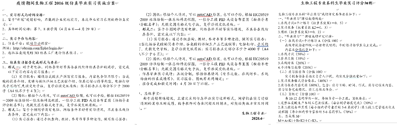 实习前,本专业根据实际情况制定了《疫情期间生物工程2016级仿真毕业实习实施方案》,重新修订了《生物工程专业本科生毕业实习评分细则》,通知学生按照以上方案实施(图2)。