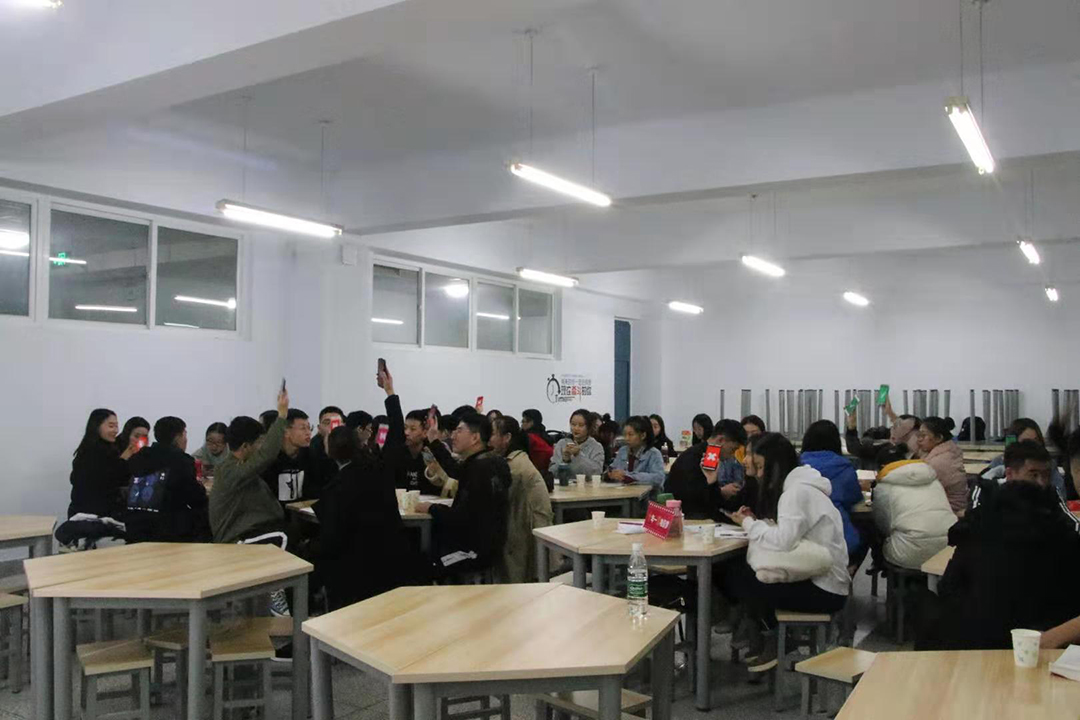主讲人制药17-2刘振宝同学以演讲的形式向大家分享了马歇尔·卢森堡博士的著作《非暴力沟通》。同学们就主讲人提出的“你所了解的暴力沟通与非暴力沟通是什么”展开了讨论。在游戏环节,主持人给出了一些关于“发言者表达的是不是不带评论的观察”的一些句子,同学们展开激烈的讨论,并且采用举牌的方式表达自己的看法。