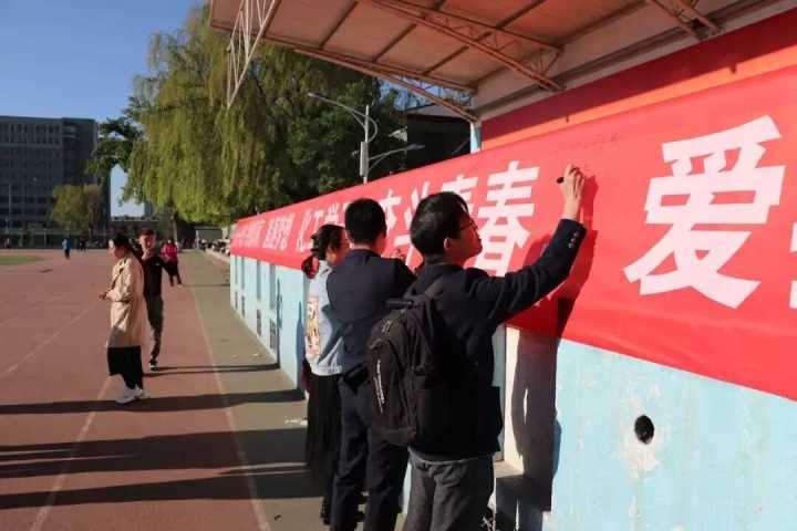 升旗仪式结束后,我院师生在"七十华夏,共渡风雨,追逐梦想;化工学子,奋斗青春,爱我中华"的条幅上郑重的签下名字,在5.20之际,表白祖国。