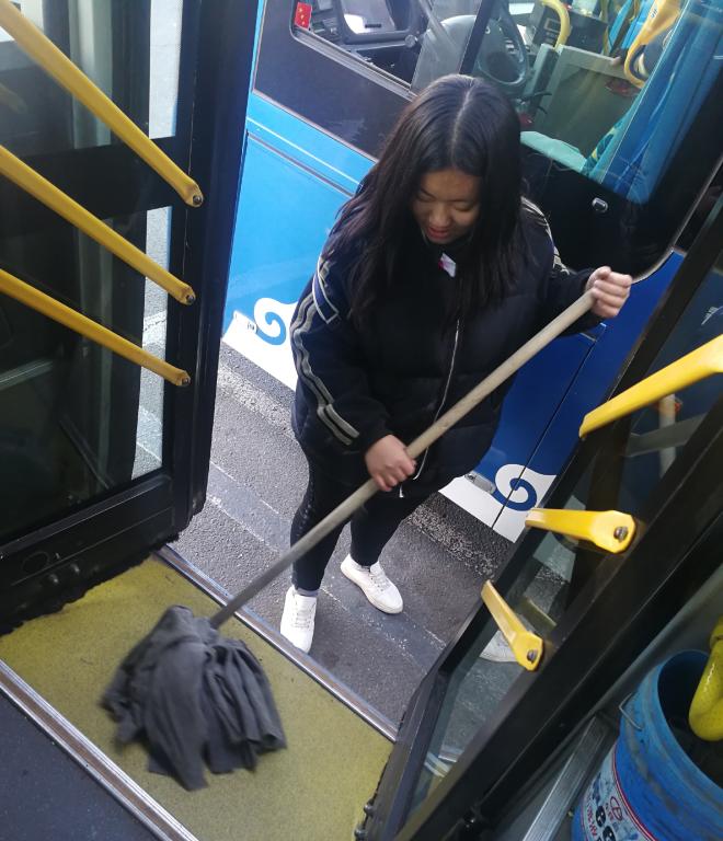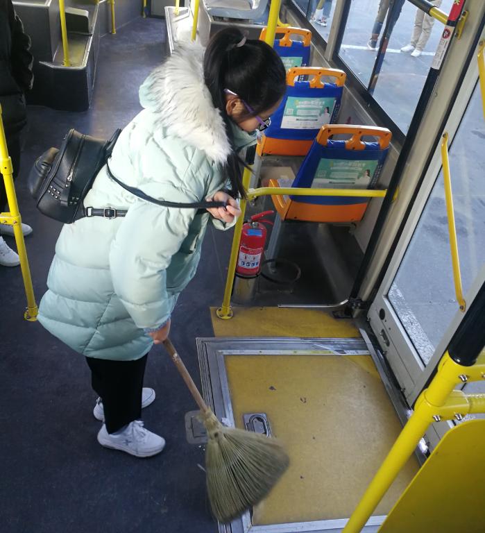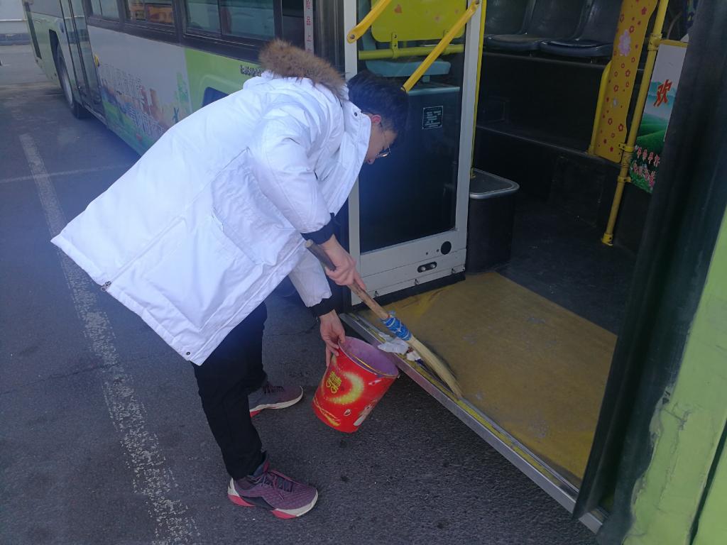 冬日的寒冷也未能阻挡志愿者们的服务热情,长期未打扫的公交车内积满了灰尘污垢,志愿者们不惧寒风,不怕脏累,抱着积极的态度进行工作。他们身着化工学院志愿者服,激情满满的投入志愿活动中,利用各种工具认真仔细地擦洗了公交车内的每个角落,没有一丝懈怠。志愿者们清扫完一辆公交车,立即赶往下一辆,四个小时的时间,将公交五公司内所有公交车都彻底清扫了一遍,并做好了善后工作。经过大家的共同努力,为青城市民打造出干净整洁的车内环境。