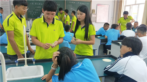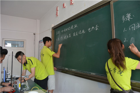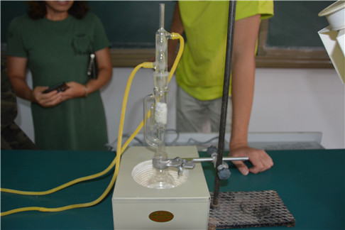 我院“三下乡”队员在锡林郭勒盟蒙古族中学化学实验室学习交流环节,面向该校高一学生开展特色化学实验——咖啡因的提取。队员们用我院的有机化学实验设备从茶叶中提取咖啡因,队员们向高一学生详细介绍索氏提取器、刺形分馏柱等有机化学实验器材,并用蒸馏、浓缩的实验等待时间和高中生们从生活、学习、化学学科等各个方面进行交流探讨。通过实验操作,激发了高中生学习化学学科、学习工科的学习兴趣提高了科学素养。同时,我院队员们在实验过程中也对专业知识的了解更加扎实,增强了实践能力。