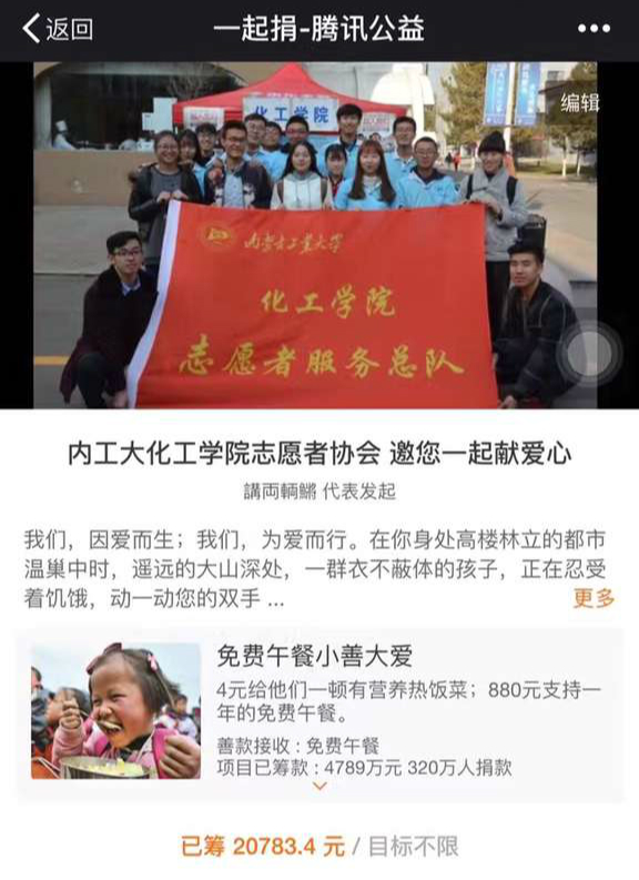 为帮助偏远地区的贫困儿童,提高青年大学生对公益事业的关注度,弘扬“乐于助人”的中华民族传统美德,进一步培养我院学生志愿服务意识,扩大当代大学生的社会影响力。11月17日至12月11日每周六、日,由化工学院申请成功的内蒙古工业大学“免费午餐公益计划大学生驿站”分别在海亮广场商业区、万达广场商业区,大昭寺城区共开展8场“小善大爱—免费午餐”劝募活动,化工学院蒲公英志愿者协会联合土木学院、能动学院等共220名志愿者参与到了劝募活动中,截止12月11日,共为山区儿童筹集午餐善款20657.4元。
