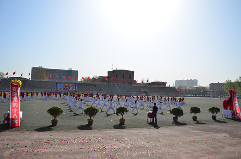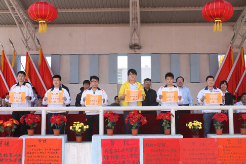 院团委书记韩晓磊宣读精神文明评比条例,运动员代表非金属11-1班王聪、裁判员代表生物11-2班王兴岩分别代表全体运动员和裁判员宣誓。由130名来自不同专业和班级的学生组成的太极拳、太极扇、太极剑方阵表演了广场舞《我的中国心》。