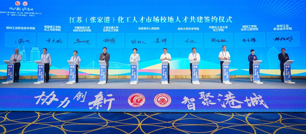 会上同时举办了“化工人才市场校地人才共建签约仪式”,陶明敏代表我院携上海交通大学化工学院、吉林大学化学学院、中国地质大学材料与化学学院等8所院校与张家港市人民政府签订了共建协议,为后续我院的毕业生就业、校政合作、校企合作开辟了新的路径。