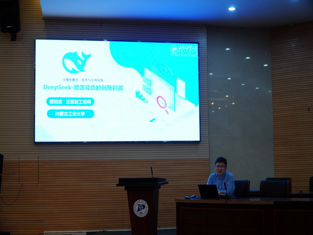 颜老师以人工智能的起源和发展为切入点,介绍了以DeepSeek为代表的大语言模型人工智能。颜老师指出开源的DeepSeek通过“瘦身架构+数据蒸馏”双轨策略,实现了从粗放式算力堆砌向注重内生效率提升的根本性变革,在国内高校数智课程升级、微专业建设等教学场景中已有广泛应用。在实操环节,颜老师详细演示了DeepSeek在行政办公、教学过程、学习生活等具体场景中的应用,包括方案优化、教学设计、文档生成和思维导图制作等实际操作案例。