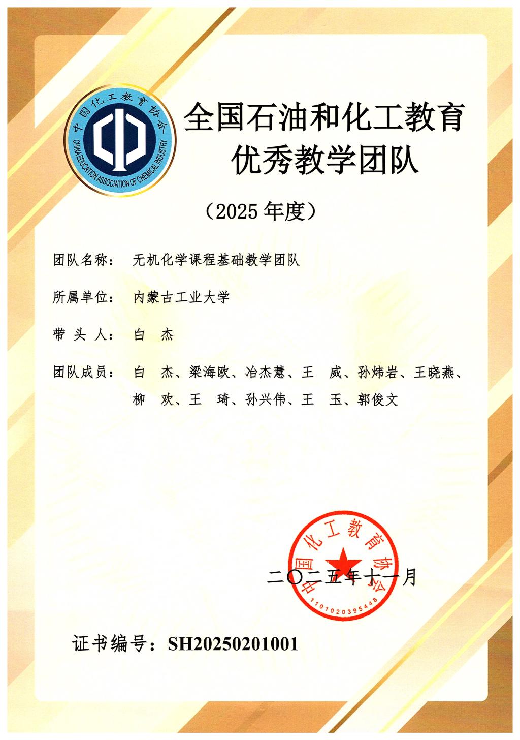 近日,中国化工教育协会正式公布了2025年全国石油和化工教育优秀教学团队认定结果。经过单位推荐、网上申报、初审认定、终审认定及结果公示等环节,内蒙古工业大学化工学院“无机化学课程基础教学团队”凭借其在教学改革、人才培养和团队建设方面的卓越表现,成功入选“全国石油和化工教育优秀教学团队(本科院校)”,这是我院在化工教育领域获得的又一项国家级重要荣誉。