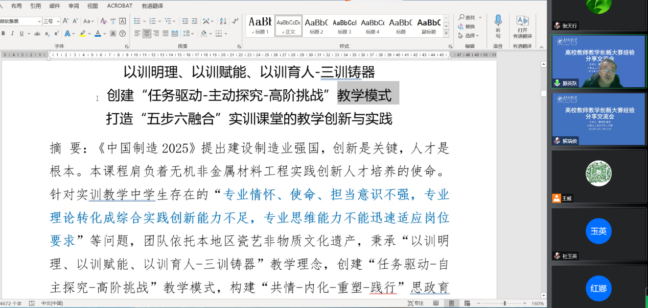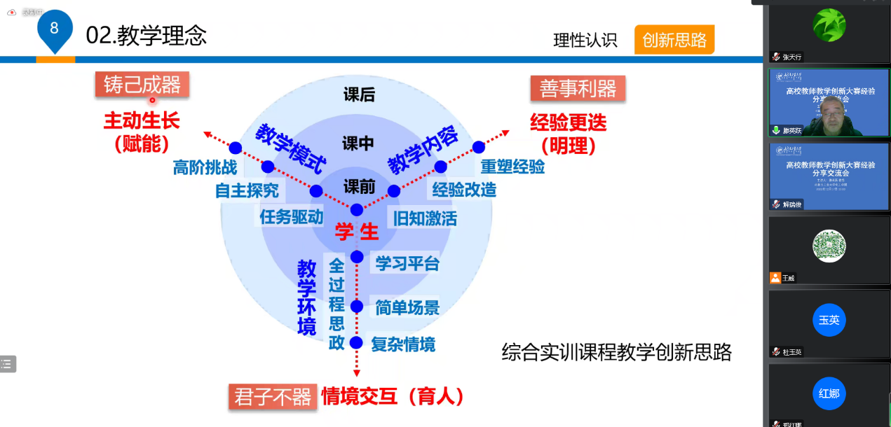 学院紧扣建设高质量教育体系主题,积极推动教学创新,有效助力“四新”建设,12月17日晚,邀请研究生院副院长、第二届全国高校教师教学创新大赛获奖团队教师滕英跃教授在线上举办了教师教学创新大赛培训交流会。我院一流课程负责人以及拟参加学校教学创新大赛的50余位教师参加培训,副院长解瑞俊主持培训会。