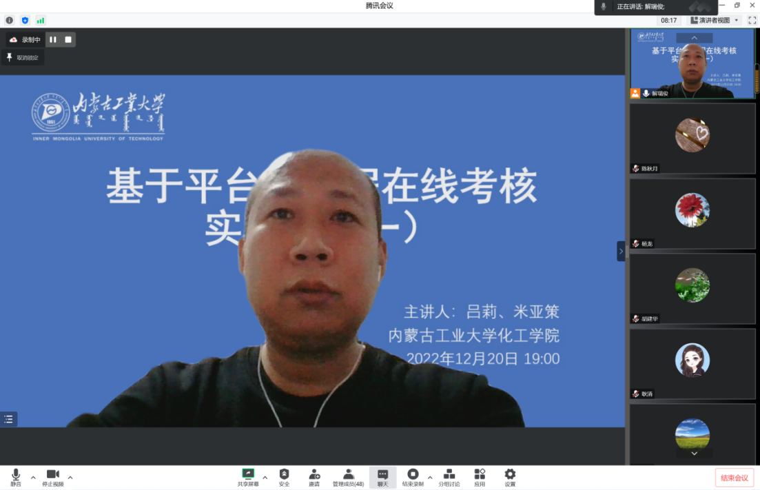 为助力我院教师更好的完成实践类课程的在线考核,保证实践课程教学质量,化工学院组织策划“基于平台的课程在线考核(实践篇)”经验分享交流会,副院长解瑞俊主持培训会。
