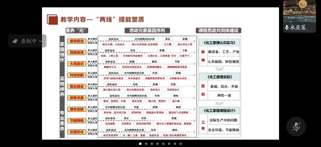 米亚策老师以《化工原理》课程为例,把课程思政矩阵体系建设的经验对全院教师进行分享,与会教师对课程思政教学实施过程中遇到的问题进行相互讨论、交流。
