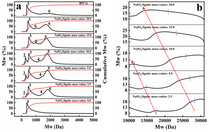 图2 不同NaIO4/褐煤质量比下褐煤解聚后可溶性产物的分子量分布