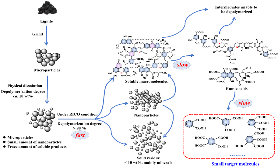 基于褐煤结构特征实现低阶煤非能源化利用已引起越来越多的关注,温和条件下实现褐煤定向解聚被认为是褐煤清洁高效利用的重要途径。将褐煤解聚转化为高值化学品是一个复杂的动态过程,涉及从非均相煤颗粒转化为均相产物的复杂过程。褐煤氧化解聚过程中涉及大分子物质(如腐殖酸等)的形成及进一步的分解,目前对这一过程中结构演变微观过程的认识尚不清晰,很难精确地调节和控制反应过程以提高产物的选择性和产率。因此,揭示由褐煤颗粒到产物的结构演变过程对于理解定向解聚过程至关重要。
