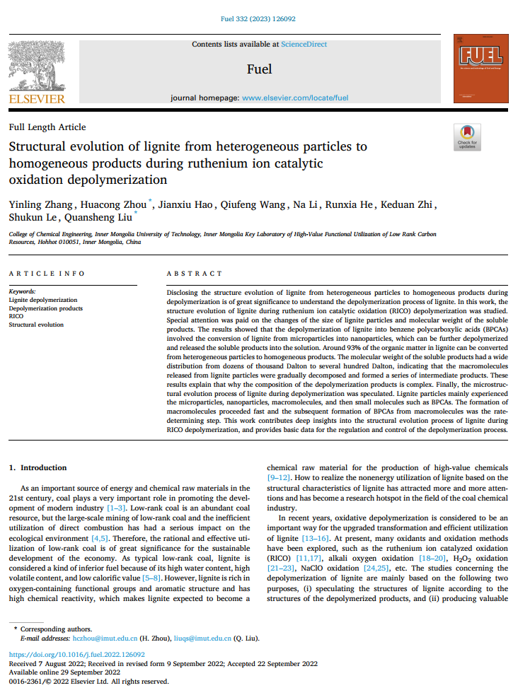 该工作依托“内蒙古自治区低阶碳质资源高值功能化利用重点实验室”和“草原英才创新团队”进行,得到国家自然科学基金 (21968021,21868021,21868020)、内蒙古自治区自然科学基金“杰出青年”项目 (2022JQ04)、“草原英才”工程、中央引导地方项目(2020ZY0010)、内蒙古科技计划项目(2020GG0289)以及内蒙古重大科技项目(2021ZD0020)等项目经费支持。相关研究成果近日发表在国际能源领域知名期刊Fuel上(Fuel, 2023, 126092),论文第一作者为2020级硕士生张银苓,通讯作者为化工学院催化与资源化工研究室刘全生教授和周华从教授。