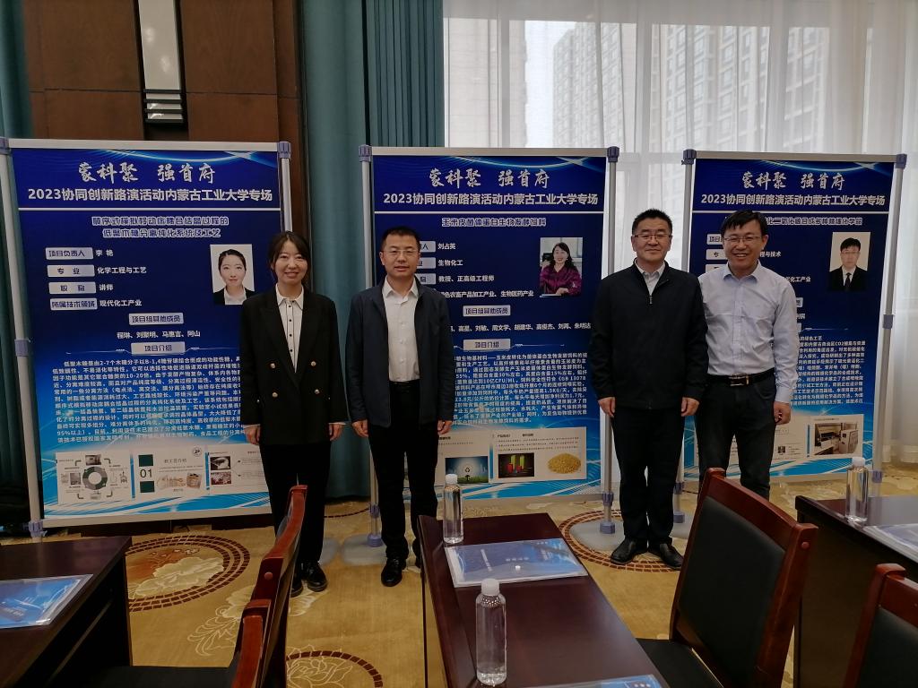 化工学院副院长冀国俊等代表内蒙古工业大学与内蒙古久泰新材料有限公司等四家企业合作签约。化工学院刘占英、竺宁、滕英跃、李艳四位老师的成果:“玉米皮菌体蛋白生物发酵饲料”、“无机硫催化转化二氧化碳合成多种精细化学品”、“煤液化残渣与退役风电叶片共热解(制气)联产线性纳米碳化硅一体化合成技术”、“顺序式模拟移动床耦合结晶过程的低聚木糖分离纯化系统及工艺”依次进行了项目路演展示,现场专家给予了高度评价。最后,各位老师与现场的意向企业及技术转移服务机构进行了深入交流。