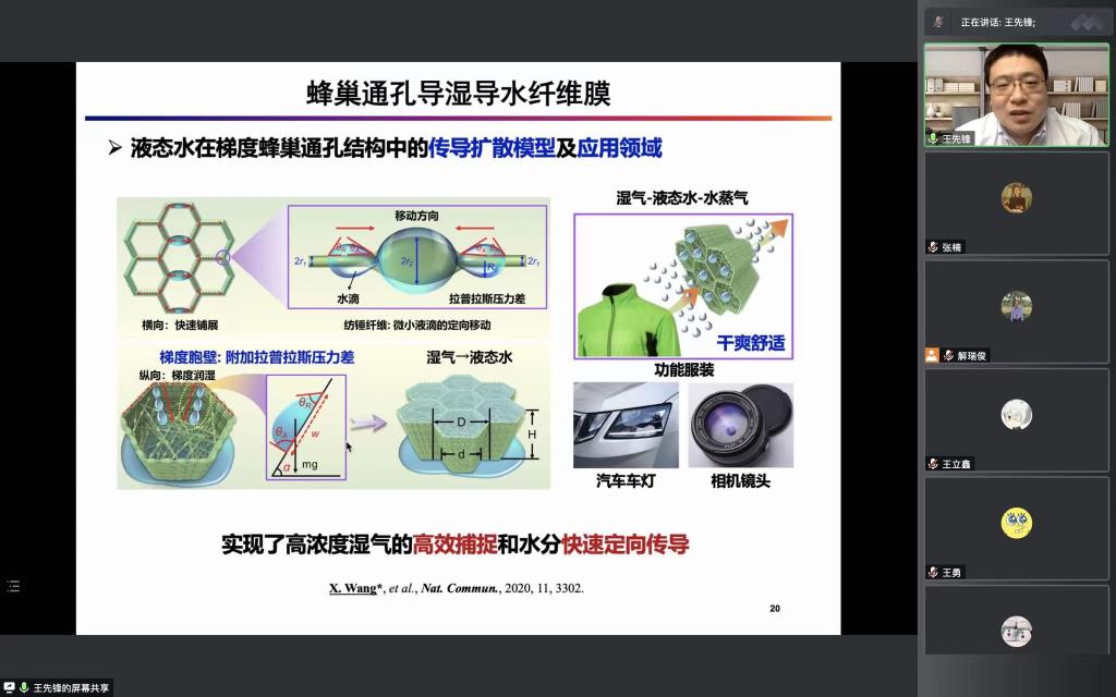 530日下午,学院与科研处共同举办线上学术报告会。会议邀请东华大学研究员、博士生导师王先锋以“智能热湿管理微纳米纤维纺织品”为题作了精彩的报告。