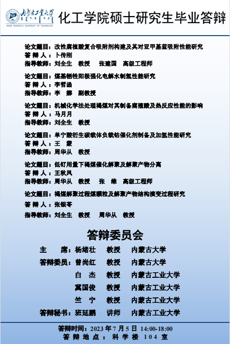 内蒙古工业大学化工学院2023届硕士研究生学位论文答辩7月5日答辩日程