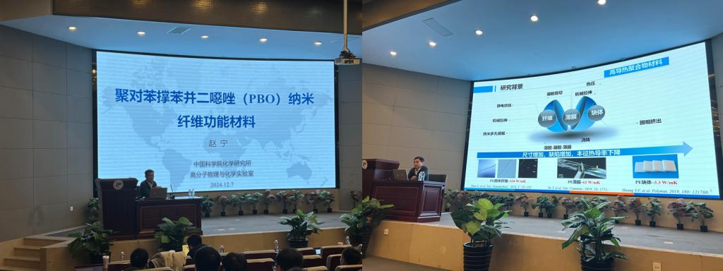 赵宁教授以具有优异的机械、耐热、阻燃和耐溶剂性能的PBO纳米纤维精确调控展开学术讲座,系统地介绍了结构与性能之间的关系,及其在高温热管理领域的应用潜力。