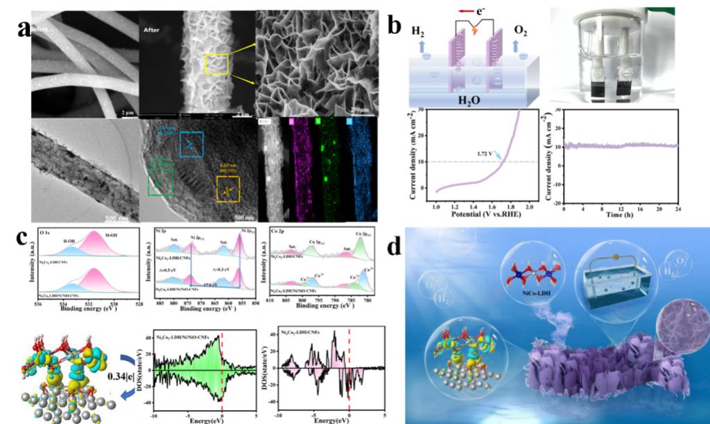 本研究成功制备了具有独特层状结构的Ni1Co2-LDH/Ni/NiO-CNFs电催化剂,通过充分利用过渡金属载体与双金属氢氧化物的巧妙结合,提高了水裂解的催化活性。作为一种双功能催化剂,该材料在1.72 V的电池电压下能够实现高达10 mA cm-2的电流密度。此外,通过模拟计算结果验证了界面金属之间的电子转移,分析了能级结构,表明界面耦合的导电金属在调节电子重新分布中起着关键作用,有效的解决了LDH电催化剂在反应过程中电导率低、催化活性不足这一重大问题。