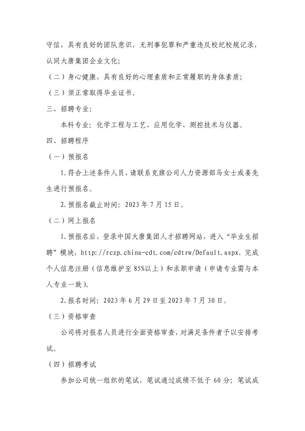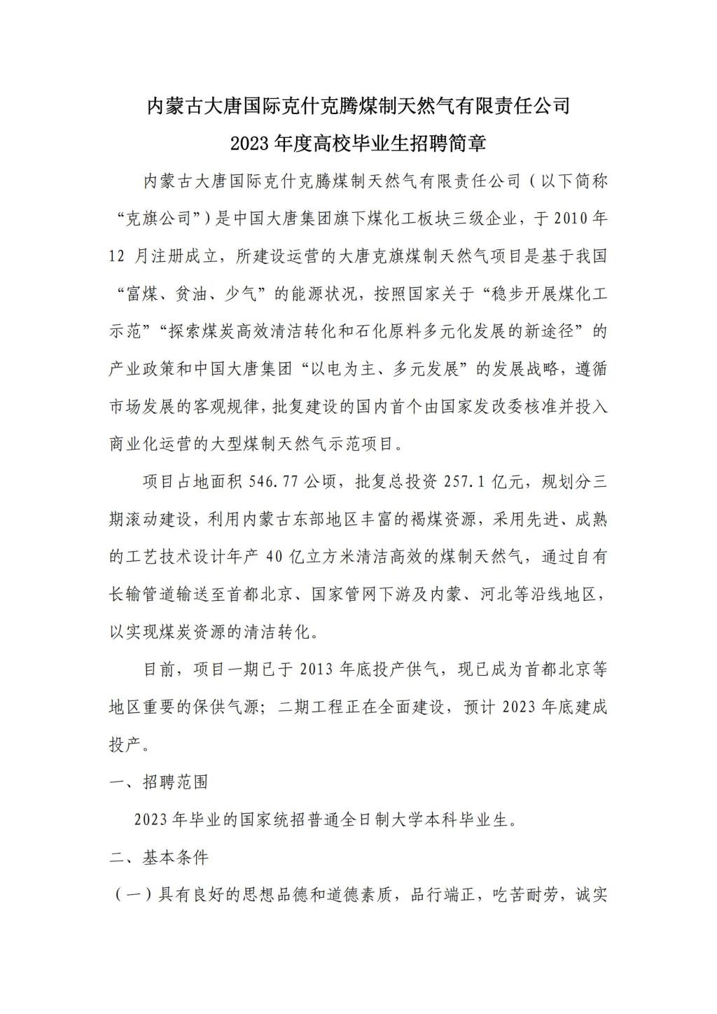 内蒙古大唐国际克什克腾煤制天然气有限责任公司2023年度高校毕业生招聘简章