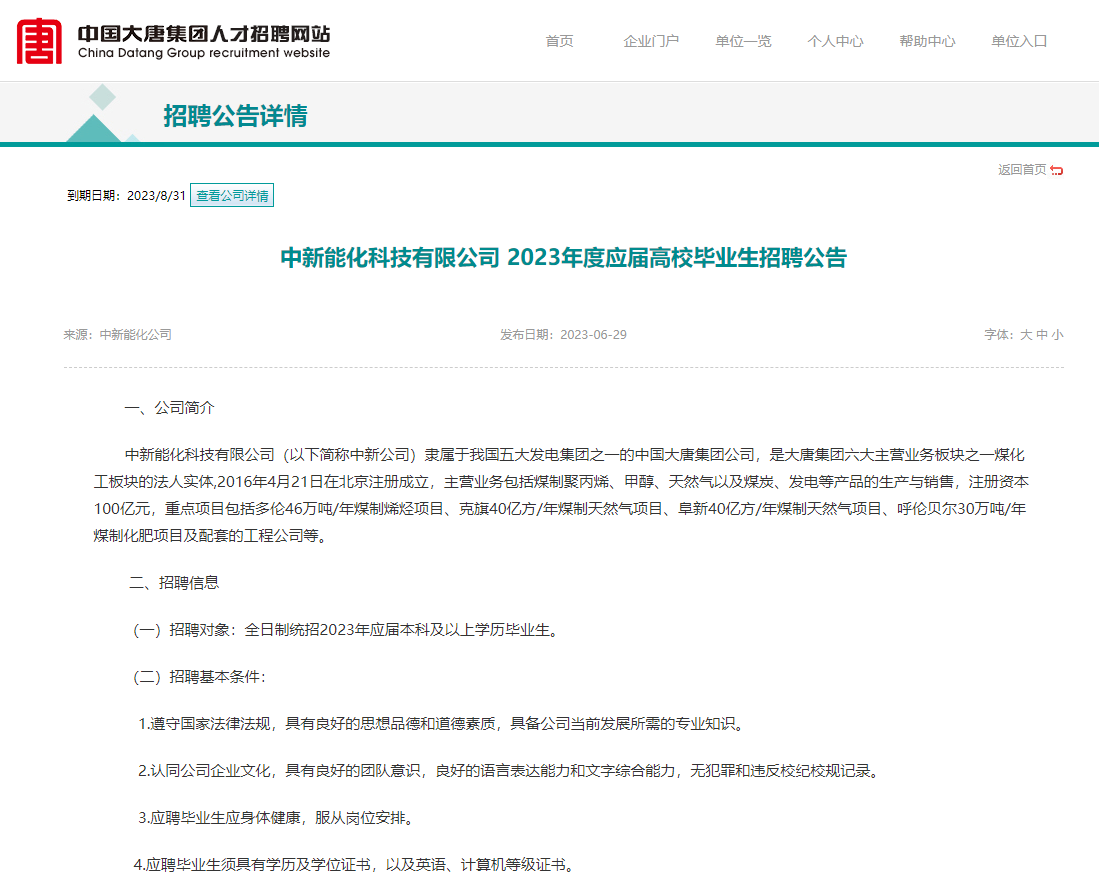 内蒙古大唐国际克什克腾煤制天然气有限责任公司2023年度高校毕业生招聘简章