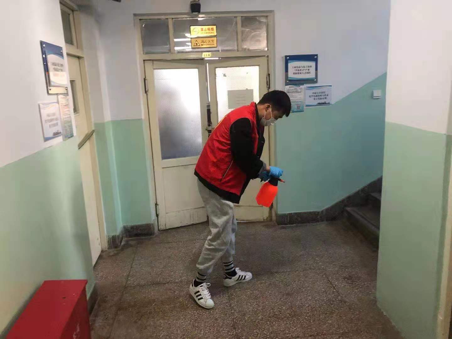 为加强落实疫情防控各项工作,在疫情防控中进一步发挥党支部战斗堡垒作用和党员先锋模范作用,化工学院研一研二学生党支部在认真配合好学校安排的疫情防控工作基础上,于2021年10月26日起,组织支部四十余名党员,分为十组,每日上午和下午为化学楼进行消毒,由于化学楼内进行的均是科研实验工作,部分实验室及设备对消杀工作有特色要求,出于安全考虑,每班负责消杀的学生党员均在相关教师的具体指导下,安全使用消毒工具开展消杀工作。