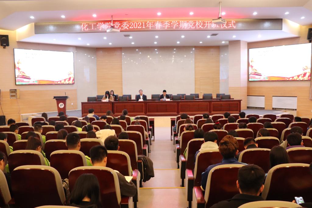 化工学院党委2021年春季学期党校于3月18日晚在化工楼报告厅开班。学院各支部党校学员共450余人参加开班仪式。会议由院党委委员、党委专职组织员、团委书记任敏主持。院党委书记王凯出席会议并担任主讲人,讲授《学习宣传贯彻2021全国两会精神》的专题党课。