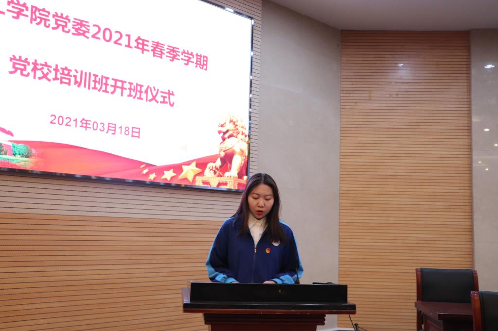 开班仪式上,院团学办公室副主任张宇宣读《化工学院党委2021年春季学期党校培训学习安排及考核办法》,制药18-2陈天娇同学代表2021年秋季学期党校学员发言。