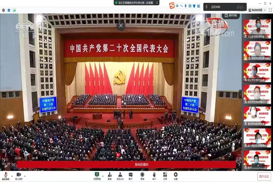 九万里风鹏正举,千秋业华章续谱。10月16日上午十时,化工学院党委组织全体师生党员、团员观看学习中国共产党第二十次全国代表大会开幕会。全院共309名党员、407名团员观看直播。