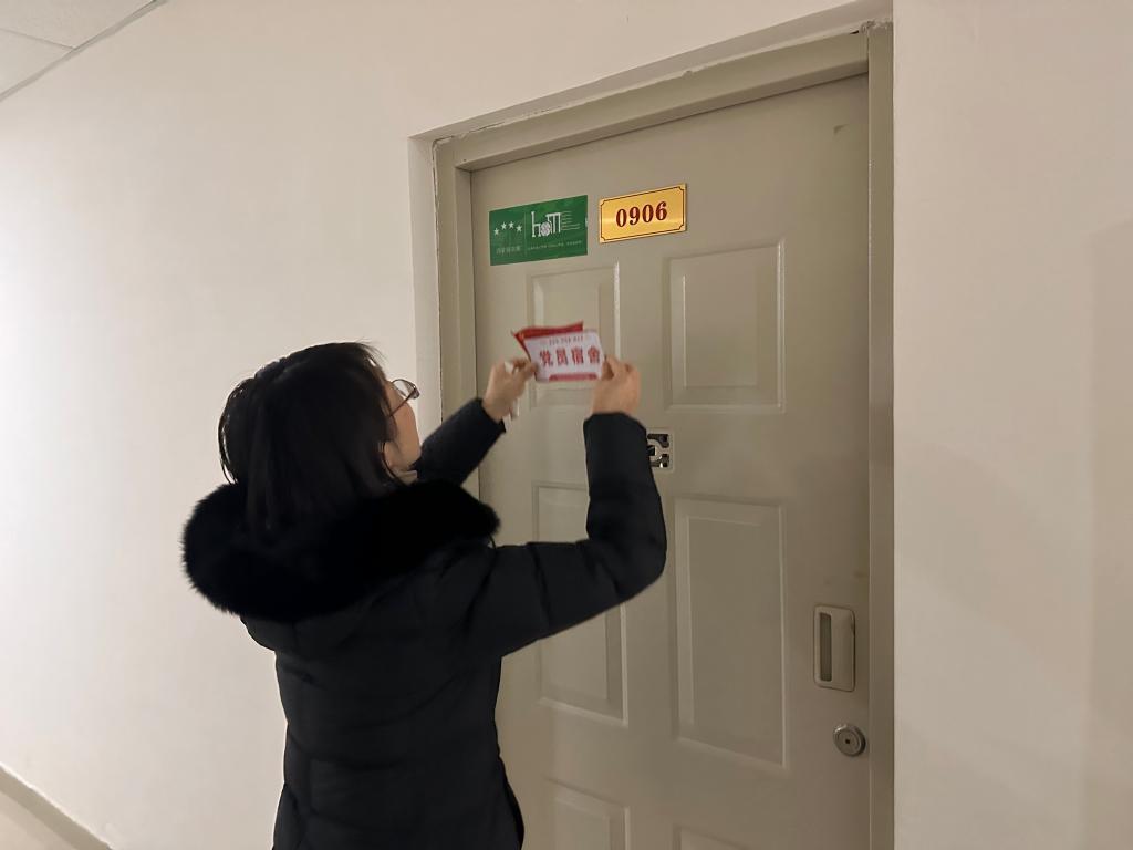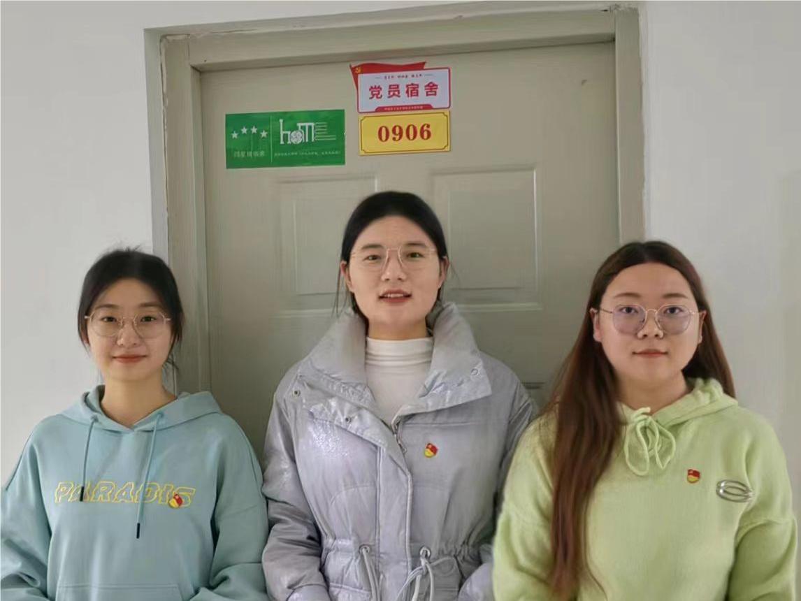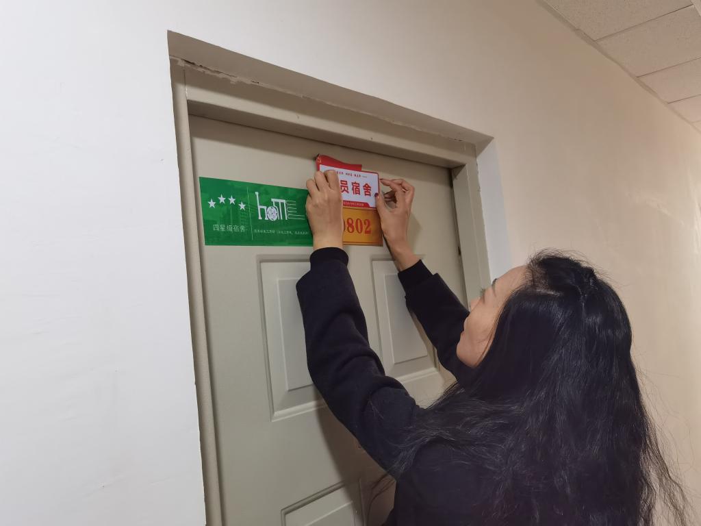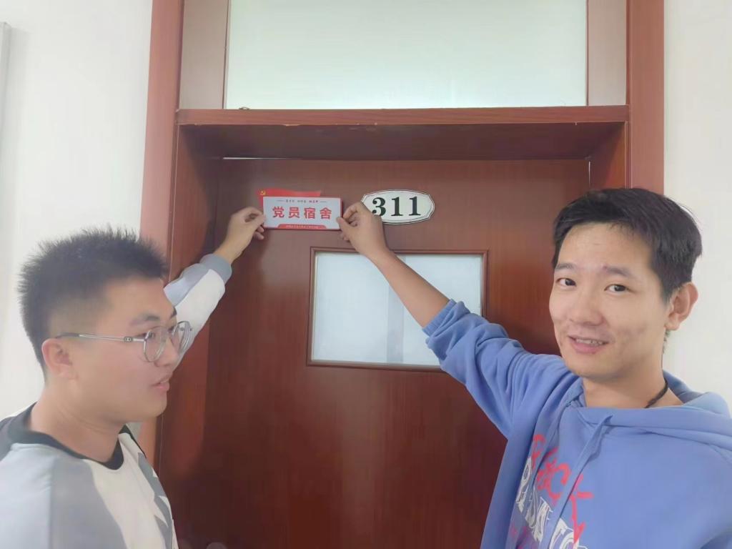 化工学院党委副书记、副院长李佳、党委委员、专职组织员任敏、学生工作办公室主任张宇与学生党支部书记一起为学生党员宿舍张贴“党员宿舍”标识,授牌亮身份,让学生党员由“隐”到“显”,亮出身份,参与宿舍管理与服务,带动寝室学风建设,真正做到“一名党员、一面旗帜,一间党员宿舍,一座先锋堡垒”。