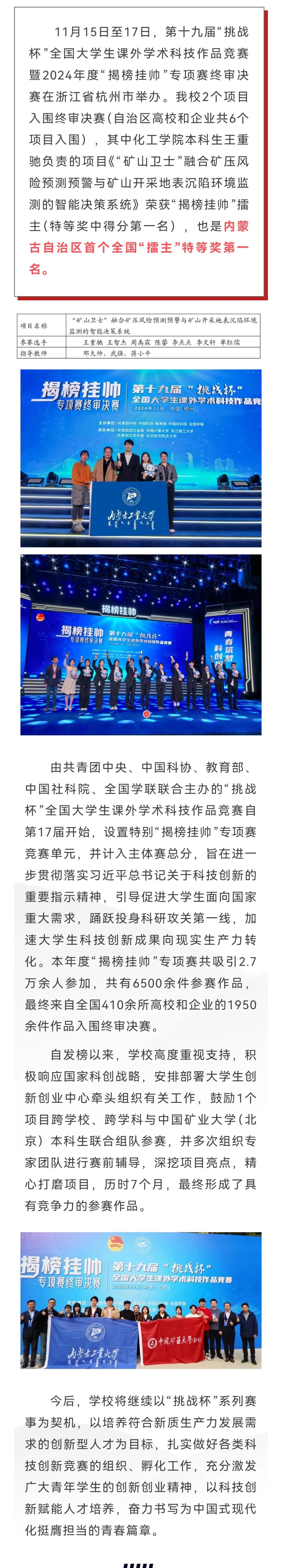 新突破|我院学生在第十九届“挑战杯”全国大学生课外学术科技作品竞赛“揭榜挂帅”专项赛中获得“揭榜挂帅”擂主
